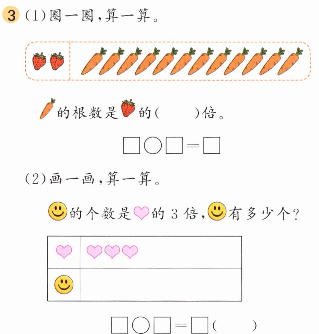 (2) 解析:本题考查倍数的应用。心形有个,笑脸的个数是心形的倍,求笑脸有多少个,就是求个是多少,用乘法计算。