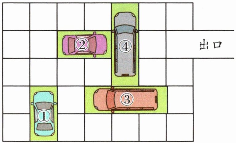 所有汽车只能前进或倒退,②号车怎样才能开出出口?想一想,填一填。