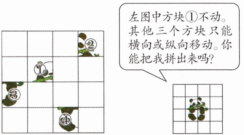 左图中方块①不动。其他三个方块只能横向或纵向移动。你能把我拼出来吗?