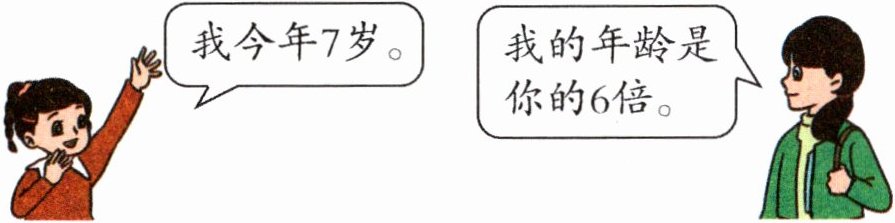 已知“我”今年$7$岁,妈妈年龄是“我”的$6$倍,求一个数的几倍是多少用乘法计算,所以妈妈的年龄为$7×6 = 42$(岁)。