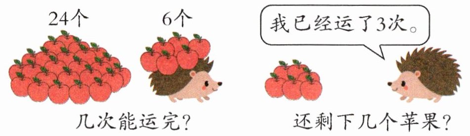 第一问,已知有$24$个苹果,小刺猬每次运$6$个,求运完的次数,就是求$24$里有几个$6$,用除法计算,$24÷6 = 4$(次)。