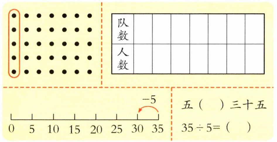 解析:本题考查除法的意义以及乘法口诀的运用。通过圈一圈的方式,将$35$人按每$5$人一组进行分组,实际就是求$35$里面有几个$5$,用除法计算,同时借助乘法口诀来得出结果。