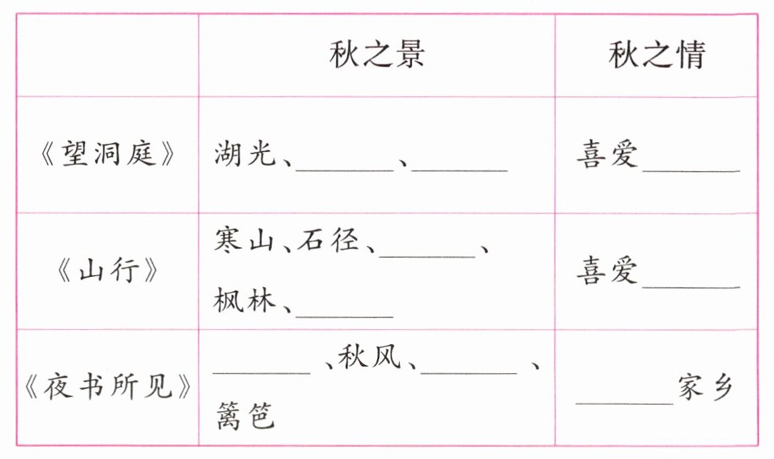 2. 从三首古诗中你找到了秋天里的哪些景物,感受到作者什么样的情感?试着填写表格。