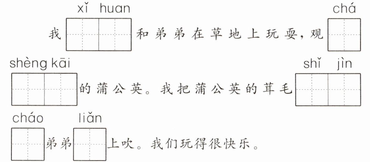 我和弟弟常常在草地上玩耍。有一次,弟弟跑在我前面,我装着一本正经的样子,喊:“谢廖沙!”他回过头来,我就使劲一吹,把蒲公英的茸毛吹到他的脸上。弟弟也假装打哈欠,把蒲公英的茸毛朝我脸上吹。就这样,这些并不引人注目的蒲公英,给我们带来了不少快乐。