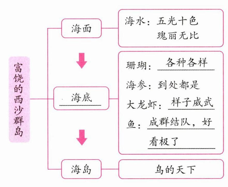 四 根据课文内容,完成思维导图,说一说从哪些地方可以看出西沙群岛风景优美、物产丰富。