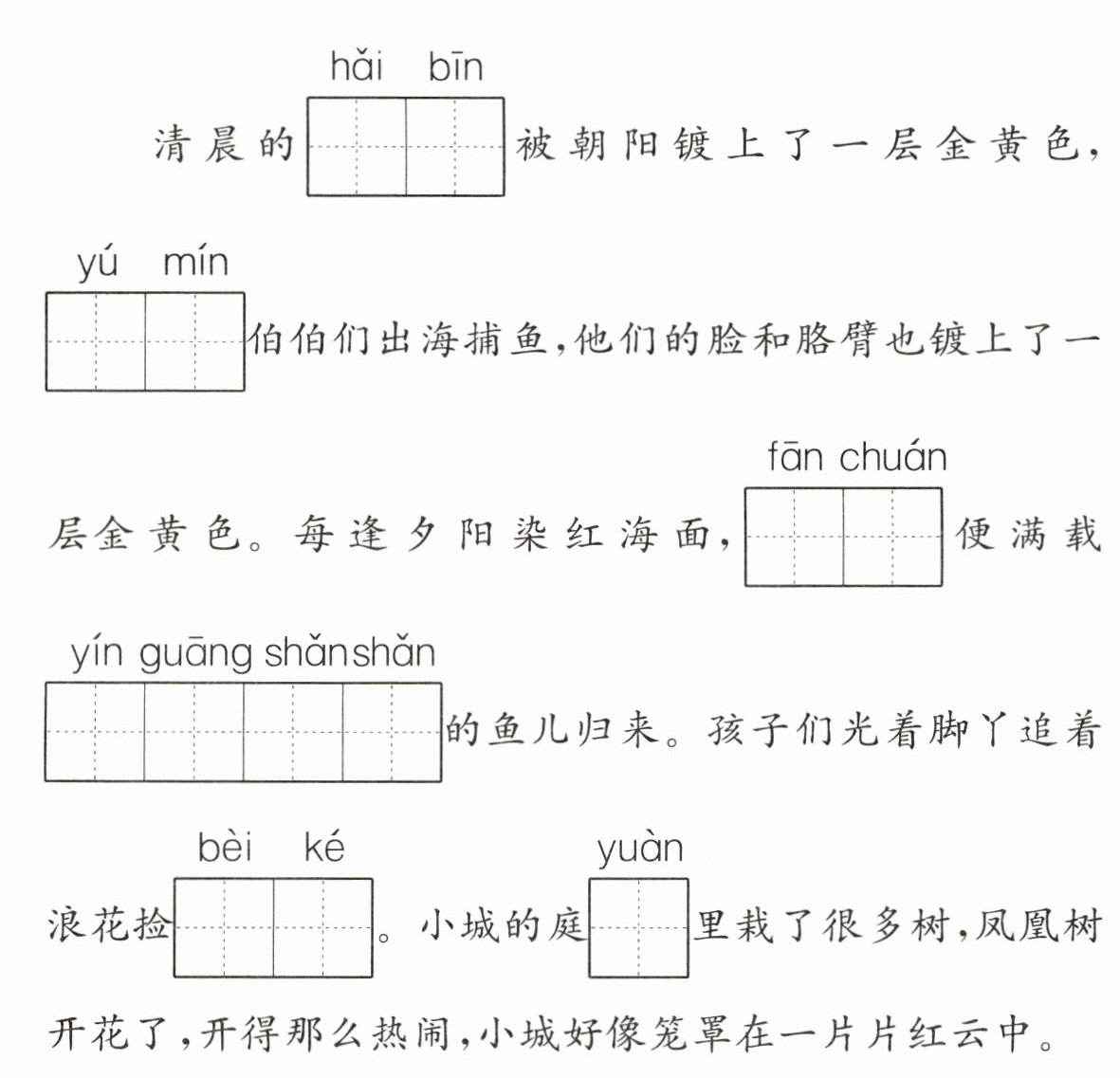 1. 海滨 渔民 帆船 银光闪闪 贝壳 院 2. dù bei féng zài