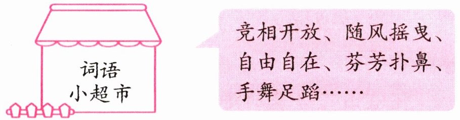 3. 放假了,花孩子是怎样在绿草上跳舞,狂欢的?试着写一写。可以从“词语小超市”中挑选你喜欢的词语哟!