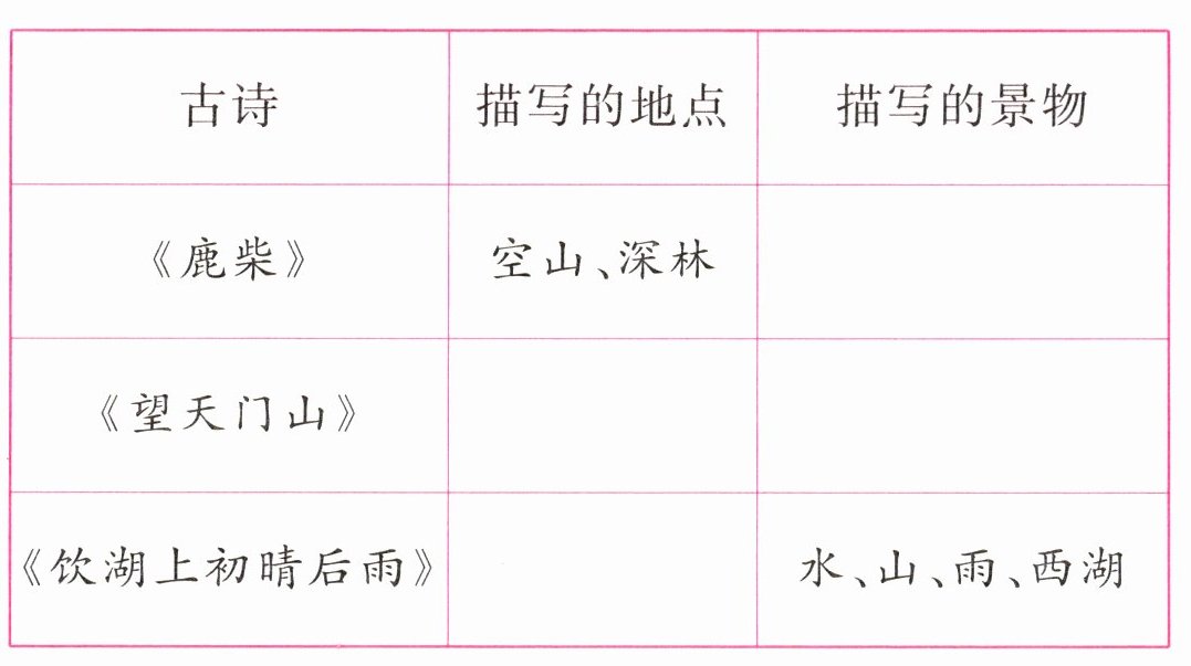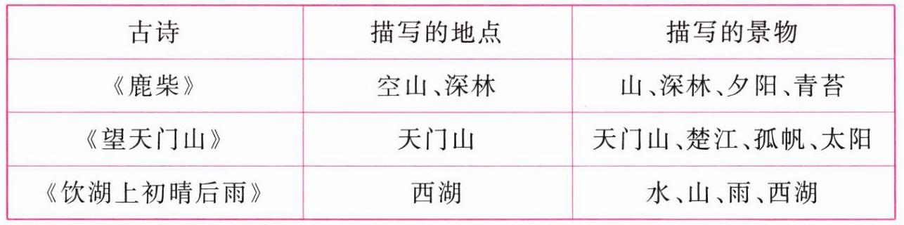 1. 读本课的三首古诗,想一想,诗中描写的是什么地方,有哪些景物?试着将表格补充完整。