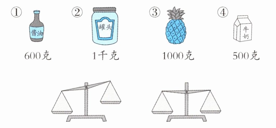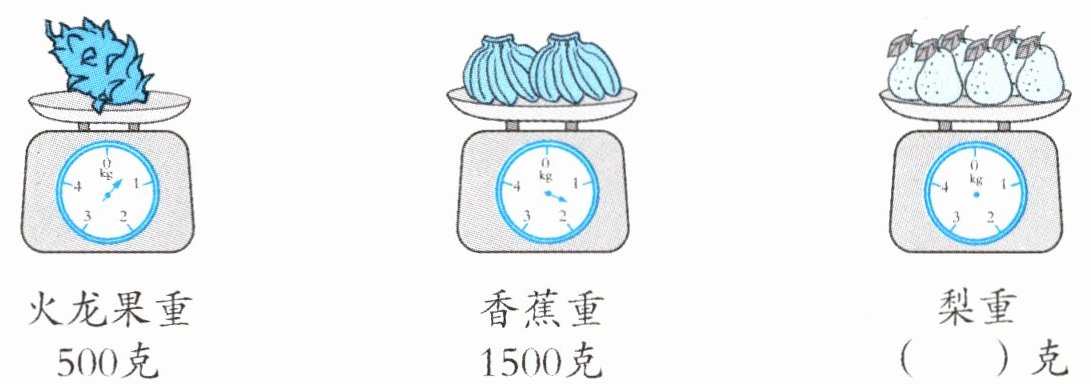 3 刘小徽给家里买了三种水果,正好 4 千克。请画出最后一个台秤上的指针。