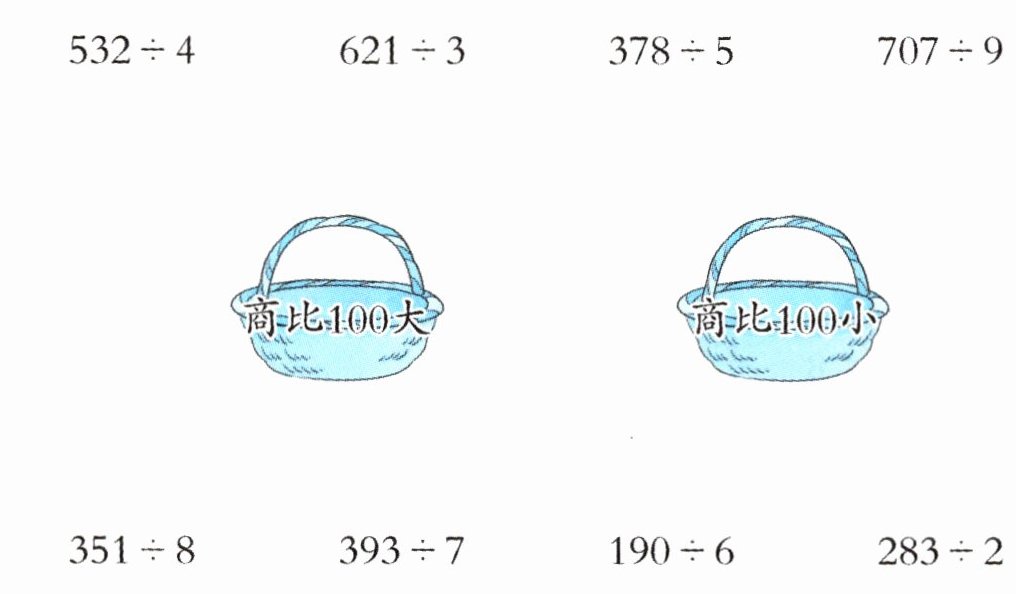 商比100大:$532÷4$、$621÷3$、$283÷2$;商比100小:$378÷5$、$707÷9$、$351÷8$、$393÷7$、$190÷6$
