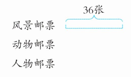 3 刘小徽收集了三种邮票,其中风景邮票有36张,动物邮票比风景邮票多16张,人物邮票比动物邮票少7张。人物邮票有多少张? (先画线段图表示题目中的条件和问题,再列式解答,并检验)