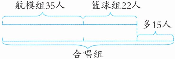 根据线段图可知,航模组$35$人,篮球组$22$人,合唱组人数比航模组和篮球组的总人数多$15$人。