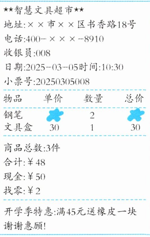 2 刘小徽去超市买文具,不小心把收银小票弄脏了。你能根据收银小票上的信息,算出一支钢笔的价钱吗?