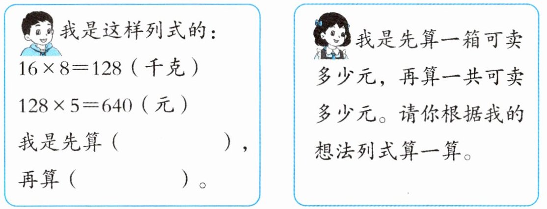 )。我是先算一箱可卖多少元,再算一共可卖多少元。请你根据我的想法列式算一算。