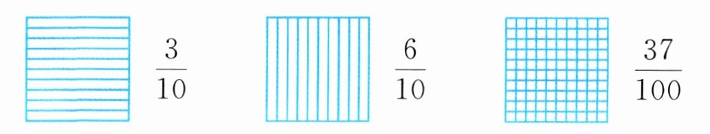 第三个图形:将正方形中的100个小方格中的37个涂色,右边的括号为0.37。