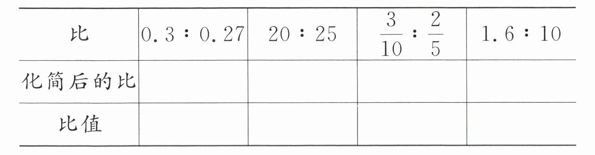 |比| $0.3:0.27$ | $20:25$ | $\frac{3}{10}:\frac{2}{5}$ | $1.6:10$ |