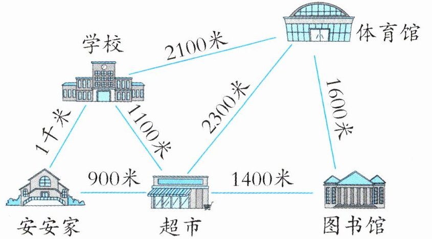 (2)安安的妈妈准备先从家去超市购物,再前往体育馆与安安会合。请先观察再仔细算一算,安安的妈妈所选择的这条路线和从家去体育馆最近的路线相比,多出多少米的路程?