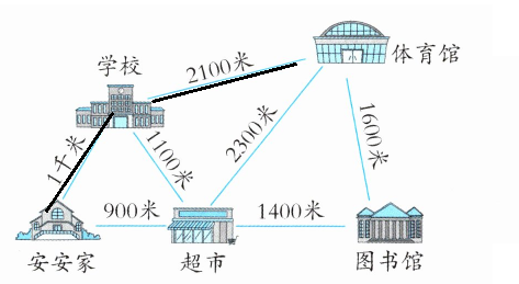 (1)安安从家到体育馆怎么走最近?把最近的路线画出来,再算一算要走多少米。