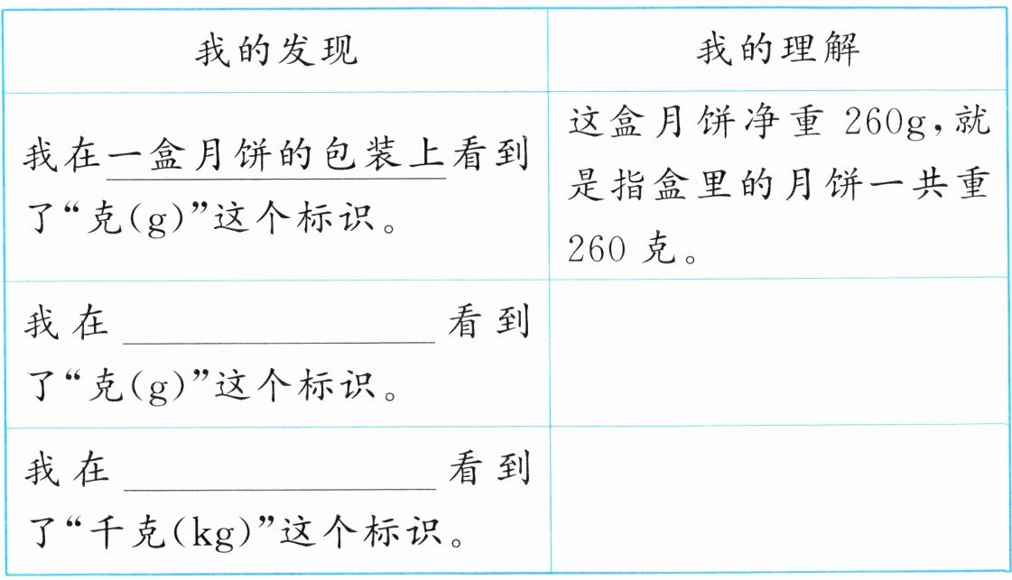 我的发现:学生可以在生活中找寻合适的物品,观察外包装上的信息填写表格。