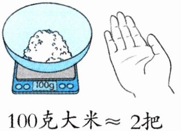 1 学生应运用手掌合理估计质量,大约抓2把米,1把红豆。