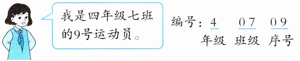 (2)佳佳是五年级二班的11号运动员,年级对应数字5,班级对应数字02,序号对应数字11,所以她的编号是50211。
