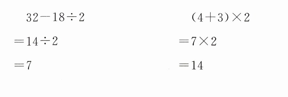 2. $\begin{align}&(4 + 3)×2 \\=&7×2 \\=&14\end{align}$