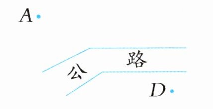 2 王村和李村分别在 $ A $ 点和 $ D $ 点处,两村计划各铺一条路,应该怎样铺才会使各自离公路最近?请画出来。