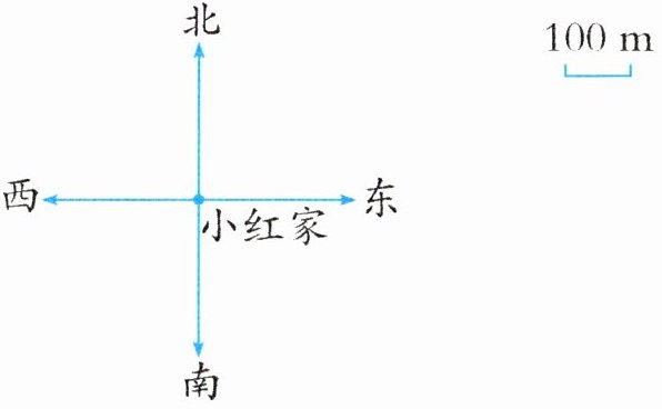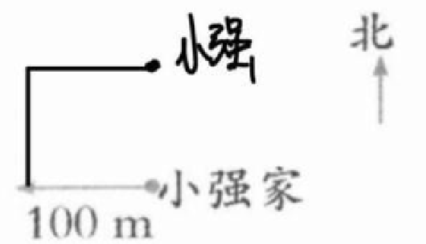 小强从家出发,先向西走$100\mathrm{m}$,再向北走$100\mathrm{m}$,接着又向东走$100\mathrm{m}$。你知道小强现在位于家的什么方向吗?他与家相距多少米?接着画完下图。