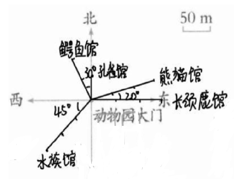 (3)熊猫馆在大门的东偏北$20^{\circ}方向150\mathrm{m}$处。