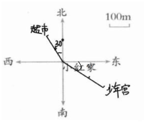小红的妈妈从家出发,向北偏西$30^{\circ}方向走200\mathrm{m}$到达超市。小红从家出发,向东偏南$40^{\circ}方向走300\mathrm{m}$到达少年宫。