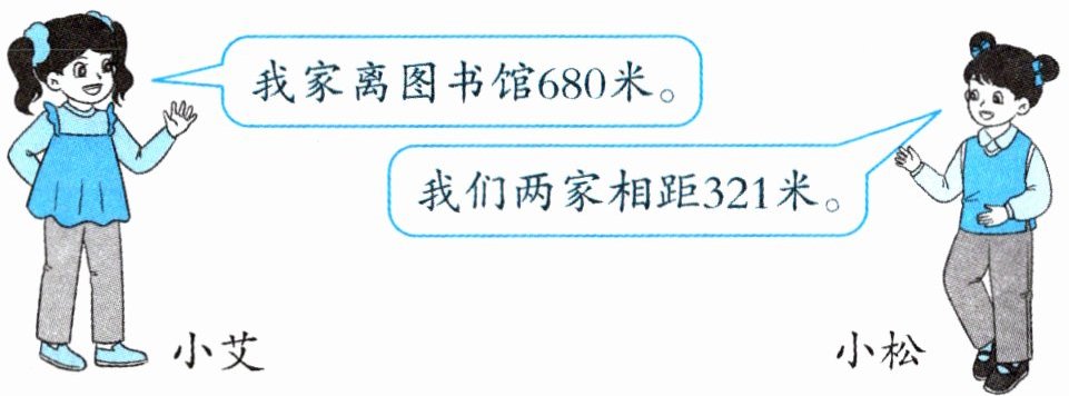 小艾:我家离图书馆 680 米。小松:我们两家相距 321 米。