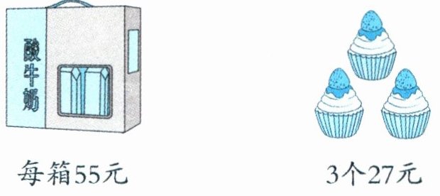 31箱酸牛奶和1个小蛋糕一共多少元?看图列式计算。