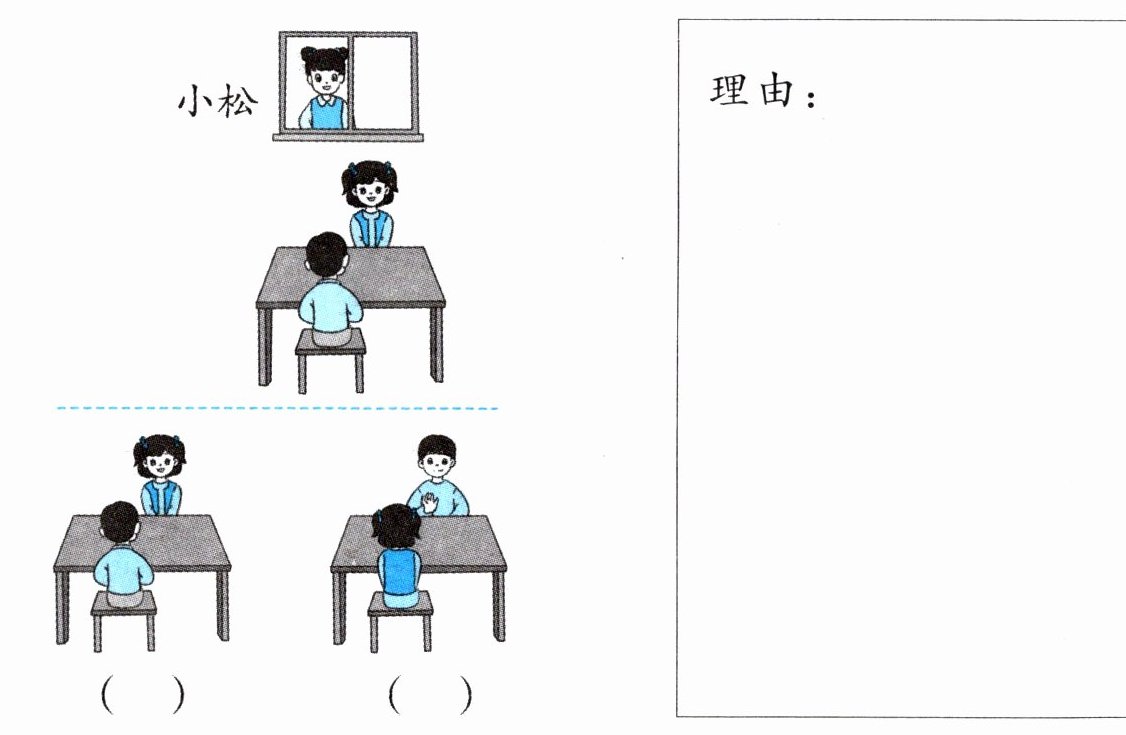 2 右图(√) 理由:小松站在女孩身后,看到的是女孩的背面;小松和男孩相对,看到的是男孩的正面。