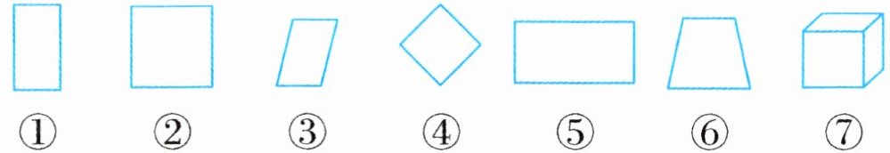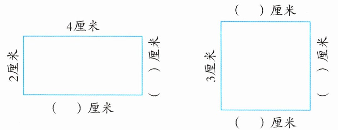 4、2;3、3、3;长方形的对边相等,四个角都是直角;正方形的四条边相等,四个角都是直角。(直角符号标记在各图形四个角)