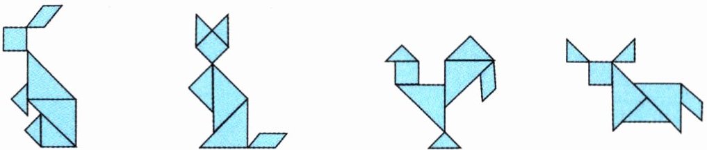 下面的图形是用七巧板拼成的,照样子拼一拼,还可以自己发挥创意拼一拼。