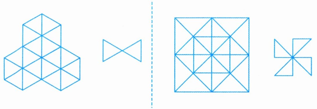 左边第一个图形中,可找到右边第二个图形(正方形中的米字格)中的基本形状,将其涂色(如最中间的小三角形组成的正方形);
