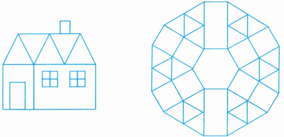 左图中:房子主体是长方形,屋顶是三角形(或等边三角形),烟囱是长方形,门是长方形,窗户是正方形。