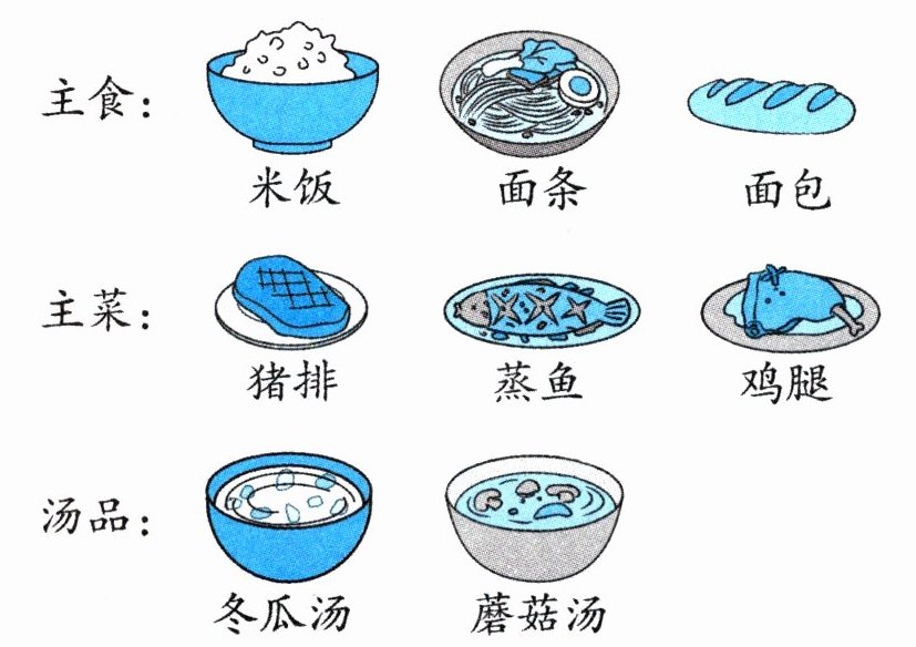 (1)一份营养套餐包含一份主食、一份主菜和一份汤品。