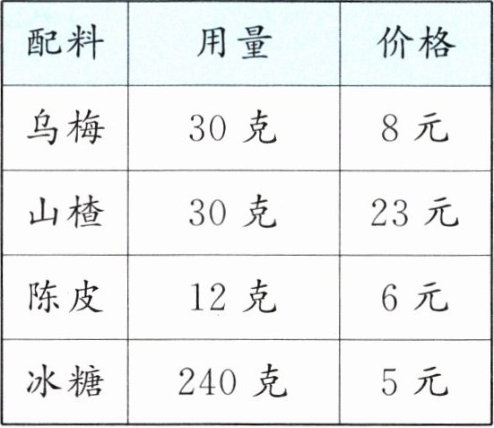 (1)小艾准备购买 3 份上述原料包制作酸梅汤,需要花费多少元购买山楂?需要购买多少克陈皮?