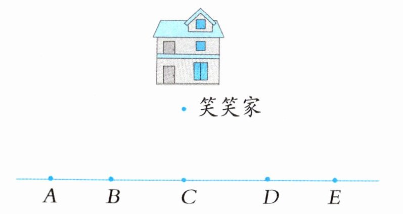 3 笑笑家附近有 $ A $、$ B $、$ C $、$ D $、$ E $ 五家书店,她去哪家书店的路程最近?请你画出来。