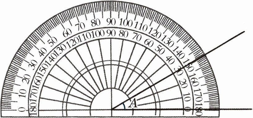 (2)下图中$∠A=($$)^{\circ }$。测量时,先使量角器的中心点与()重合,角的一条边与量角器的零刻度线(),()所对应的刻度就是$∠A$的度数。
