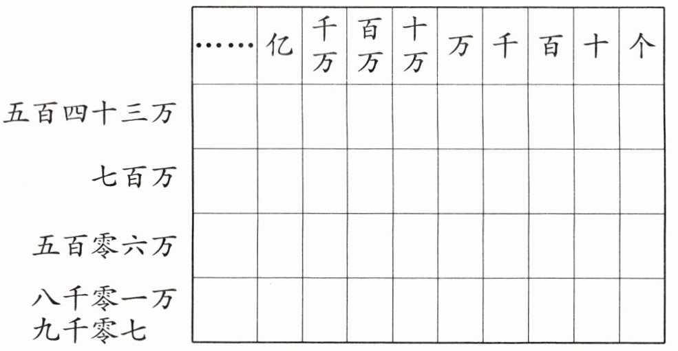 第一行(五百四十三万):5430000中从个位起左数到第七位为5,第六位为4,第五位为3,其余为0;