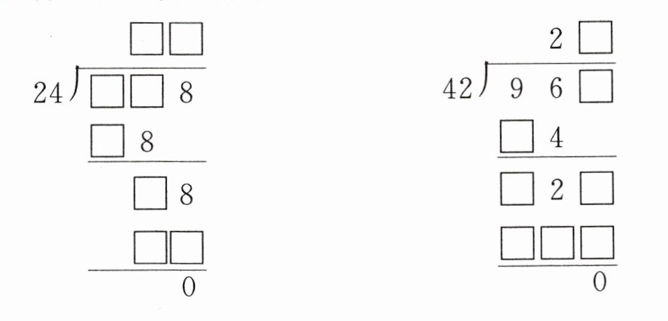 $\begin{array}{r}□□\\24\enclose{longdiv}{□□8}\\\underline{□8}\\□8\\\underline{□□}\\0\end{array}$ $\quad\begin{array}{r}2□\\42\enclose{longdiv}{96□}\\\underline{□4}\\□2□\\\underline{□□□}\\0\end{array}$