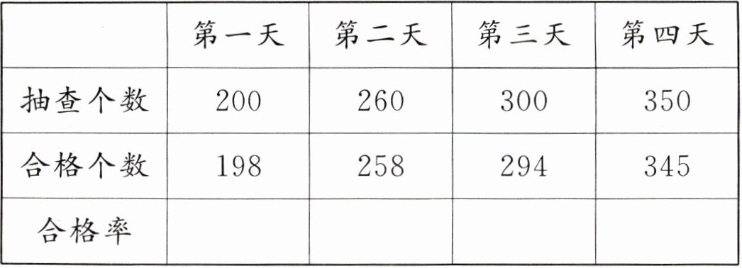 第四天合格率:$\frac{345}{350} × 100\% \approx 98.57\%$。
