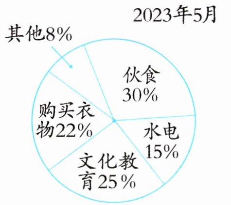 1. 李萍家2023年5月各项支出占比:伙食30%,文化教育25%,购买衣物22%,水电15%,其他8%。