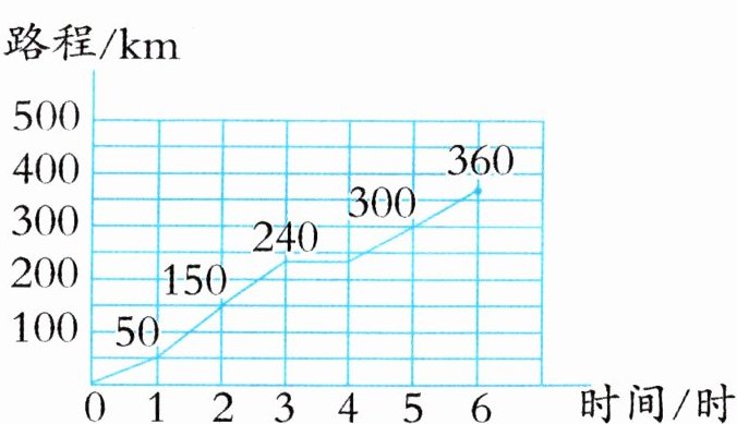1. 0-1时行驶50km,1-2时行驶100km(150-50),2-3时行驶90km(240-150),3-4时行驶60km(300-240),4-5时行驶60km(360-300);