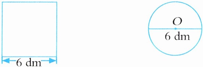 圆直径 = 6 dm,半径 $ r = 6 ÷ 2 = 3 $ dm