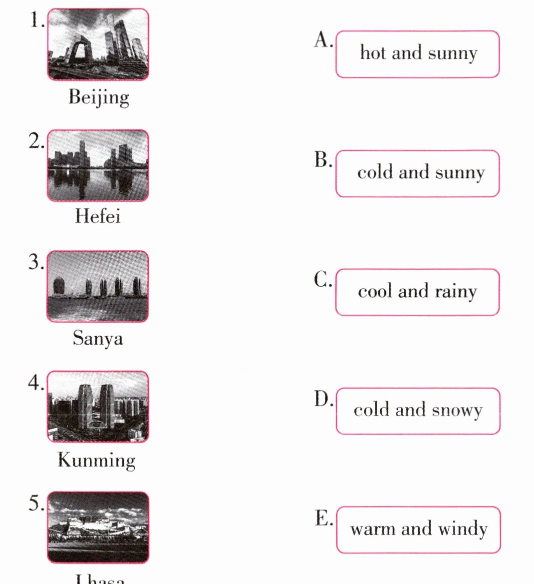 任务一:根据天气预报,将下列城市与对应的天气连线。