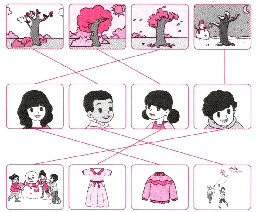 Spring is warm. Trees turn green. Flowers are pink and yellow. I wear jackets. I fly kites in the park. Summer is hot. The sun is bright. The sky is blue. I often wear T-shirts and dresses. I love to swim and eat ice cream. Autumn is cool. Leaves are red and orange. They dance in the wind. I wear sweaters. I often pick apples. Winter is cold. Snow is white. I wear coats and gloves. I often make snowmen with my sister in winter. I like all the seasons.
