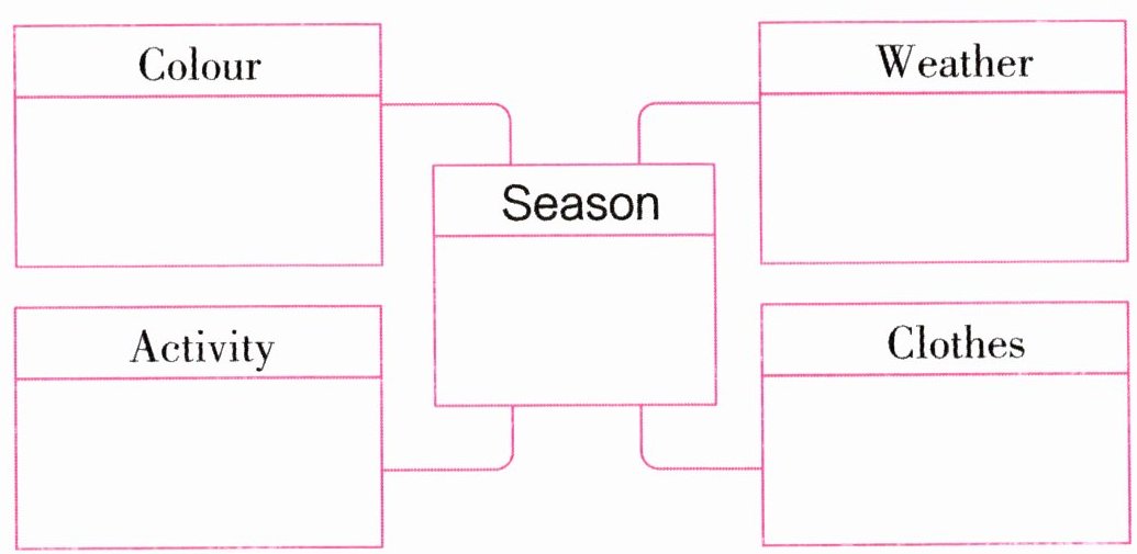 亲爱的同学,季节是什么颜色的? 不同的季节有什么样的气候? 人们在不同的季节穿什么衣服,从事什么活动? 从方框中选择合适的选项补全思维导图,再仿照例句说一说。